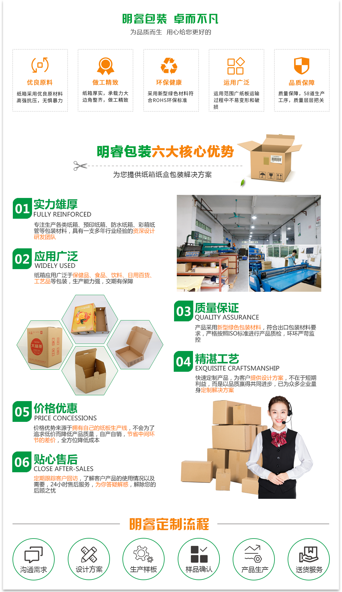 東莞市明睿包裝材料有限公司成立于2015年,位于中國制造業名城----東莞,工廠地址位于廣東省東莞市東城街道柏洲邊新田街13號2棟,環境優美,交通便利 本公司專業生產各類紙箱、預印紙箱、防水紙箱、彩箱、彩盒、啤盒、刀卡、紙護角、紙管等包裝材料。主要生產設備:高速印刷機一臺,全自動粘釘一體機一臺,三色開槽印刷機一臺,半自動糊箱機兩臺,啤機一臺,打角機一臺,高速單刀分紙機一臺,碗刀分紙機1臺,釘箱機兩臺。主要客戶有食品、電子、五金、玩具等知名企業。自創立以來一貫秉承:專業、認真、快,信守承諾,以人為本,客戶至上,追求卓越的經營理念...[查看詳情]